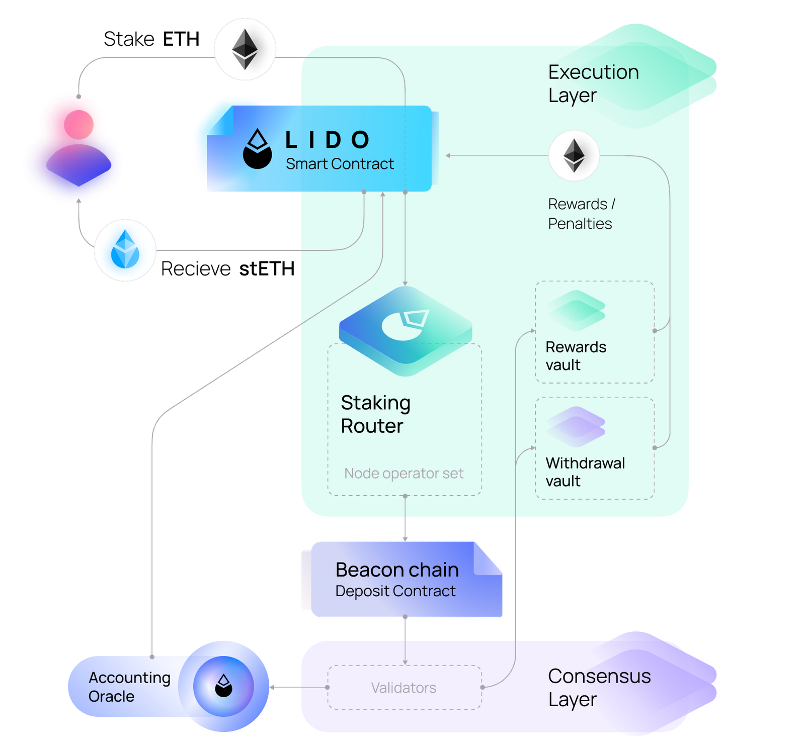 Submitting ETH to the Lido Core Protocol initiates a seamless staking process. Deposited ETH is gathered in the Lido Buffer, and in return, you immediately receive stETH tokens.