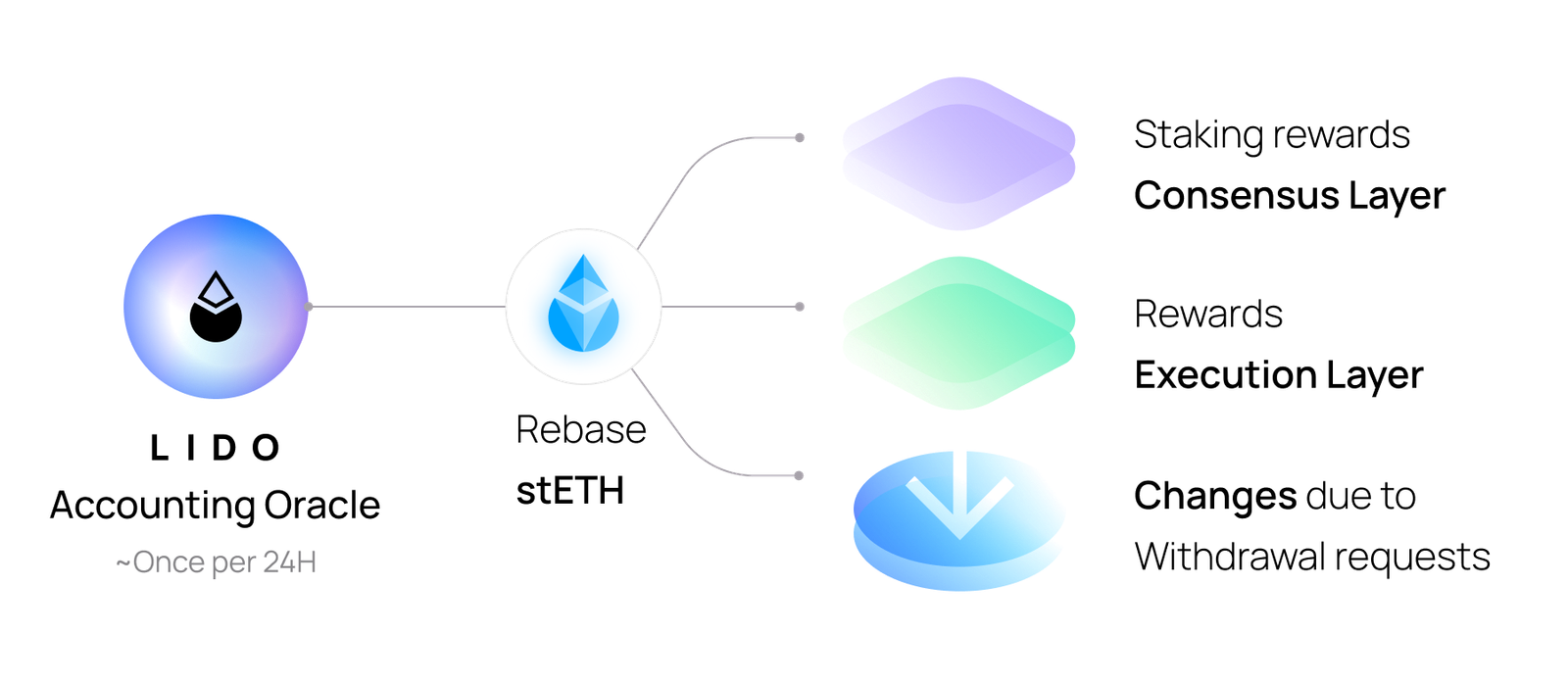The Lido oracle mechanisms are responsible for maintaining the connection between the Execution Layer and Consensus Layer portions of the Lido protocol. As a part of this set of activities, oracles synchronize data between the Execution and Consensus Layers, reflecting validator rewards and penalties for stETH holders via the daily rebase mechanism.